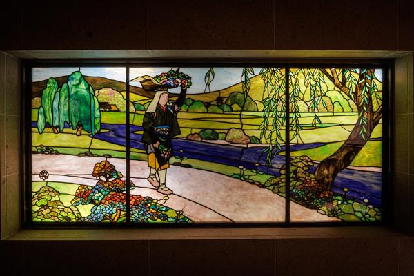 A calm, comfortable library room to read, relax and browse in, with wisteria branches on view through the window. Notice the panes of cut glass, coffered wood ceiling and stained glass at the windows. Such features reflect the newest design trends in late 19th century Japan. This inviting room retains the sense of that time.