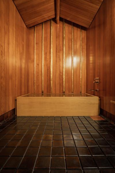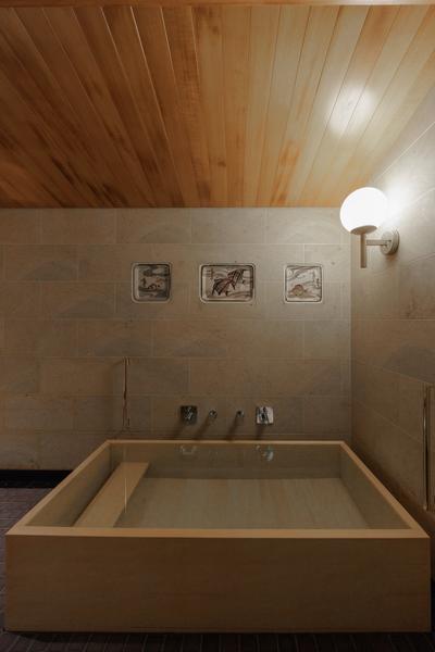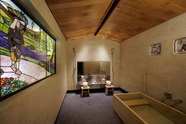 - One reservable bath features stained glass by Sanchi Ogawa and porcelain tiles by Rokubei Kiyomizu VI, notable artisans.