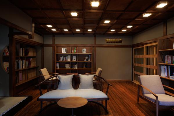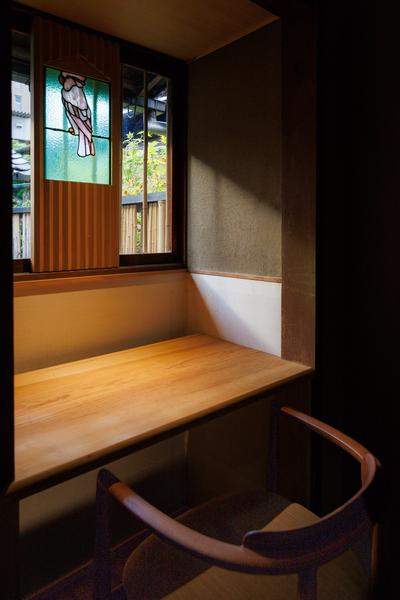 約31㎡。格天井に切子のガラスをあしらい、明治時代の趣きを残すライブラリー。窓の外の藤とステンドグラスが安らぎを与えます。