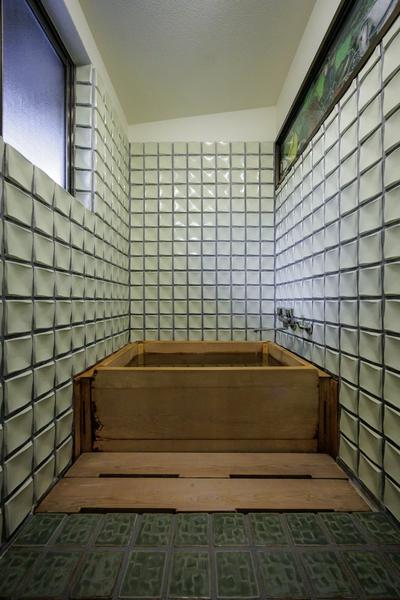 明るく開かれた縁側の窓からは、一階の主庭を眺められます。浴室は、こぢんまりとしながらもステンドグラスとタイルが配され昭和の雰囲気を醸し出しています。