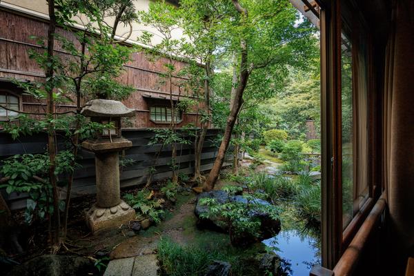 小庭に面した落ち着いた趣きの部屋。浴室には小川三知作「祇園祭」のステンドグラスが配されています。