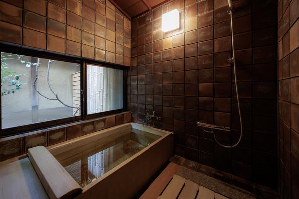 玉虫の翅(はね)細工を施した漆床が印象的な部屋。浴槽はゆったり広々とし、浴室から座敷まで坪庭を眺められます。